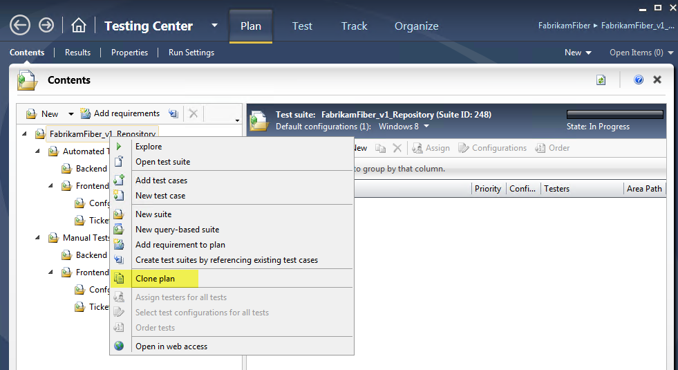 Luckily there is a build in functionality in Microsoft Test Manager for that purpose.To do so, we open the repository test plan of version 1 and create a clone of it.
